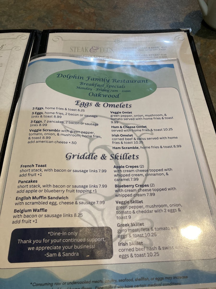 The menu at Dolphin Restaurant offers a comforting and straightforward selection perfect for family breakfasts and casual dining throughout the day. This is a place where hearty, familiar dishes come together in a relaxed atmosphere, making it an ideal spot for starting your morning or enjoying a satisfying lunch.